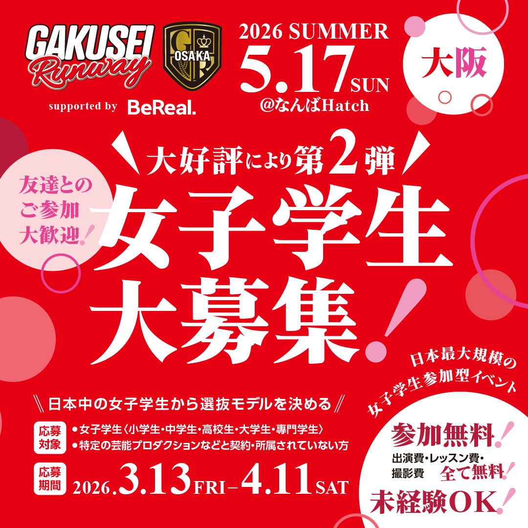 日本中の女子学生から選抜モデルを決める!日本最大規模女子学生参加型イベントGAKUSEI RUNWAY 2026 SUMMER in OSAKA開催決定!出演者大募集!